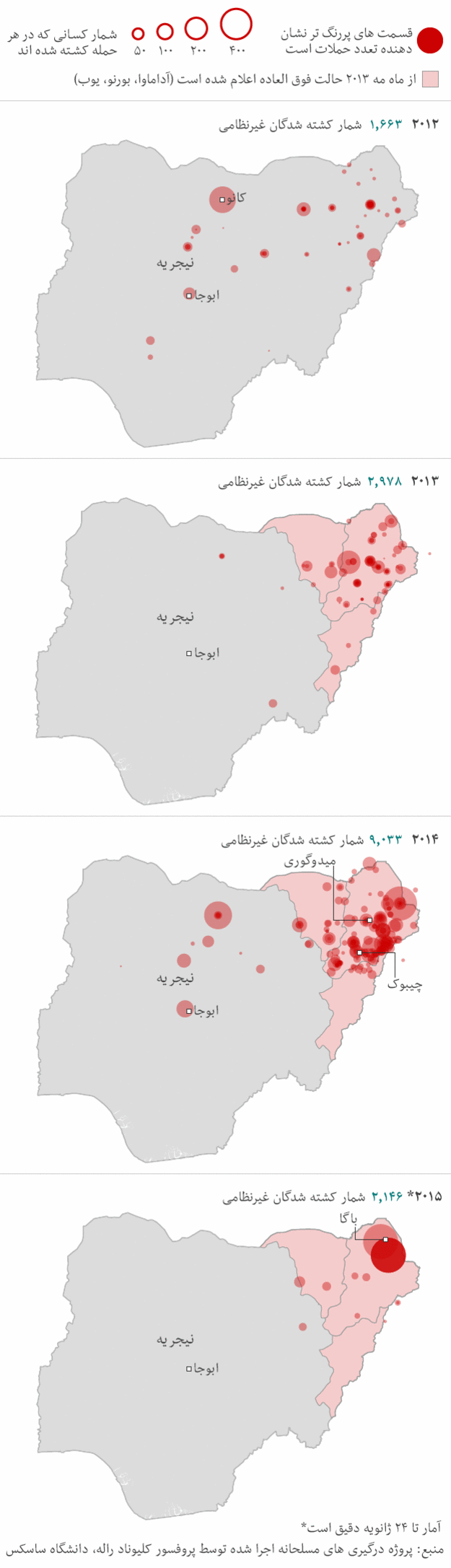 با اینکه آمار موثقی از کشتگان این حمله وجود ندارد اما بوکوحرام در شش سال گذشته هزاران نفر را کشته است. نقشهها نشان می دهند که فعالیت بوکوحرام بتدریج بیشتر در شمال شرقی ایالتهای آداماوا، بورنو و یوبه متمرکز شده. در این مناطق از سال ۲۰۱۳ وضعیت اضطراری اعلام شده است. بوکوحرام همچنین در سال ۲۰۱۴ به حملات خود شدت بخشیده است.